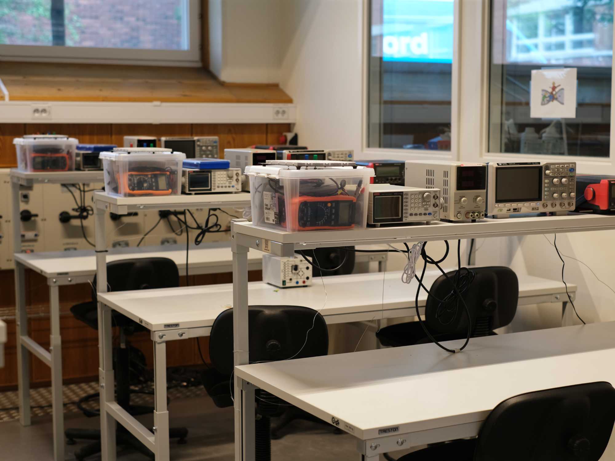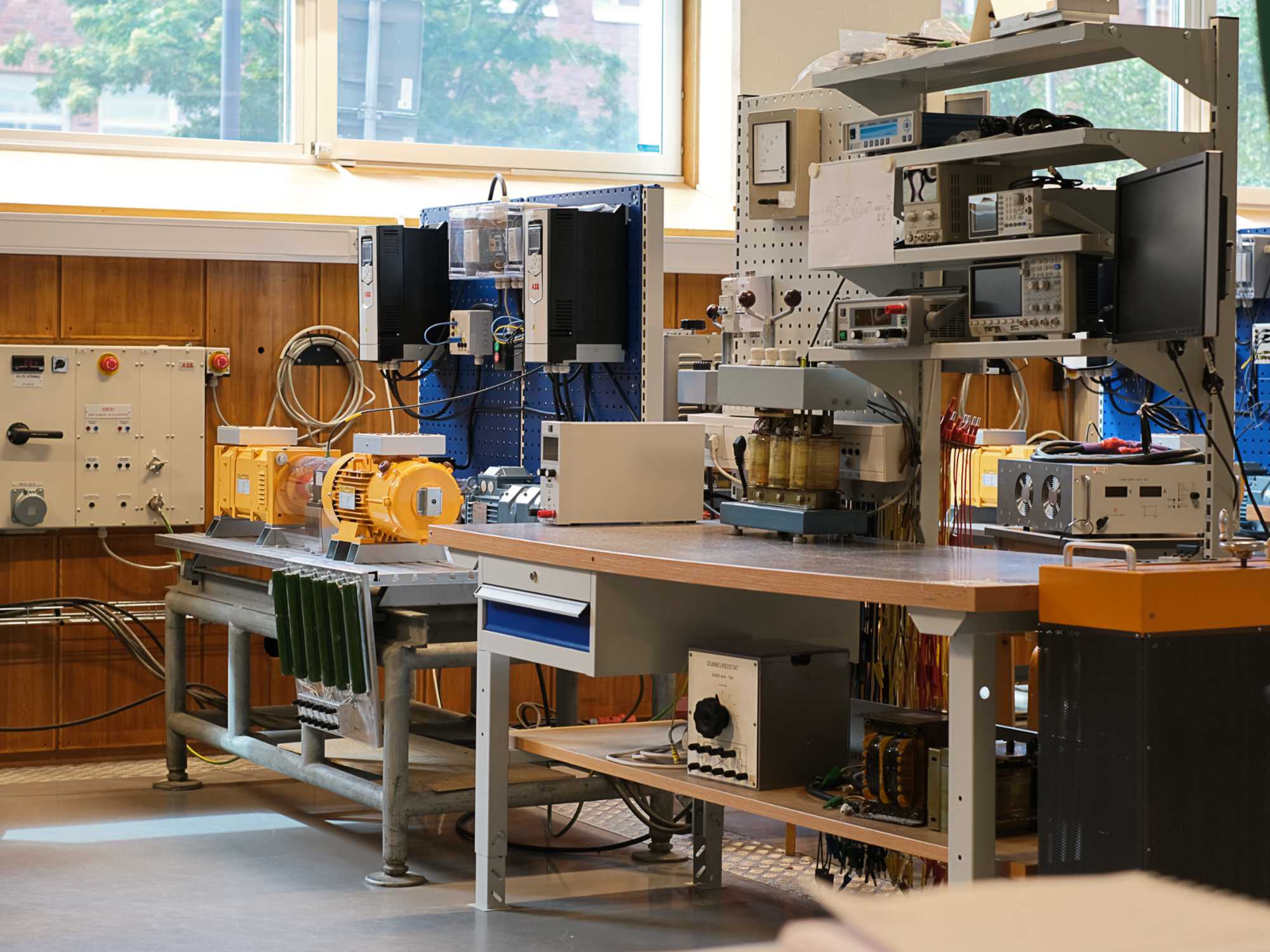 Seven lab benches with AC/DC machine pairs and access to fixed and variable power supplies. Various power electronic converters (voltage source converter, thyristor converters, DC/DC converters) and their control is available. All necessary instrumentation for student labs, multimeters, oscilloscopes, current and voltage probes etc.